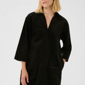 Lyhyt samettimekko mustana. Sivutaskut ja 2/3 mittainen hiha.