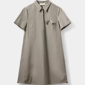 Kauluksellinen mekko lyhyellä hihalla. Sivusaumoissa taskut. Edessä koristerintatasku rusetilla.