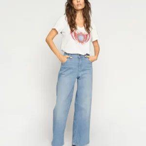 Joustava pehmeä denim , leveä lahje ja navan korkeudella oleva vyötärö. Super mukava vaalea farkku. Väljää kokoa koska farkku joustaa. Suosittelemme valitsemaan yhden koon pienemmän jos haluaa istuvamman farkun koska kangas joustaa esim. vyötäröltä hyvin.