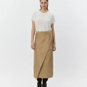 Midi-mittainen kietaisuhame jonka materiaali on jämäkkää puuvillaa. Koristetaskut edessä ja takana. Nappikiinnitys sivusaumassa. Normaalimitoitus.
