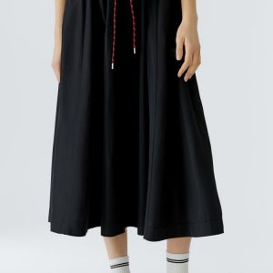 Väljän mallinen A-linjainen midimittainen hame taskuilla. Vyötäröllä kiristettävä nauhakuja.