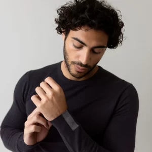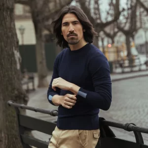 Ohut siistipintainen neule joka toimii niin toimistossa kuin vapaa-aikanakin. O-pääntie. Hihansuussa vaaleammalla sinisille oleva yksityiskohta.