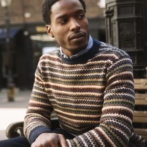Raitaneule villa/puuvillasekoitteella. Helmassa ja hihansuussa sininen leveämpi raita joten tämä neule käy hyvin farkkujen kanssa yhteen. Mitoitus: normaali