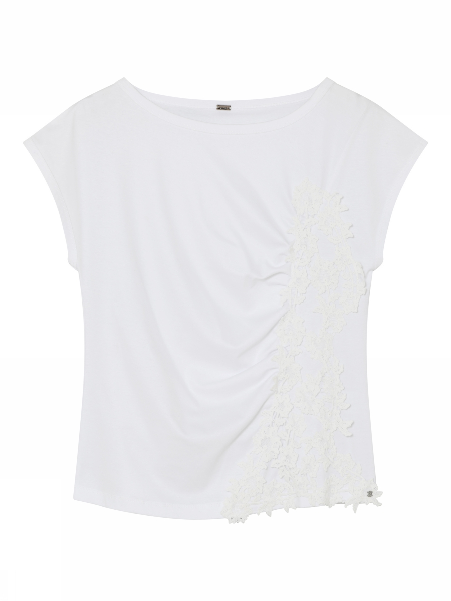Venepääntiellä oleva t-paita jonka sivussa kulkee röyhelökuvio. Hieman sisään otettu vyötärölinja. Normaali istuvuus. Väri: valkoinen