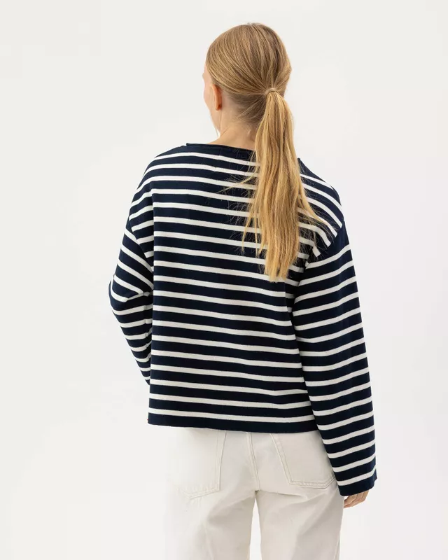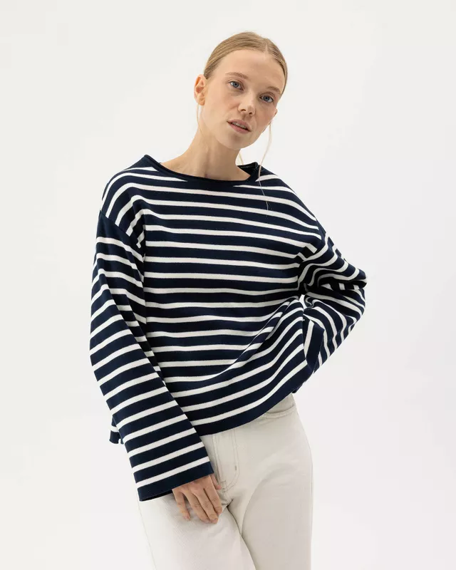 O-pääntiellä oleva puuvillaneule jossa tummansininen raita / offwhite