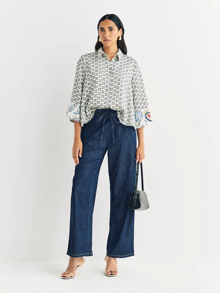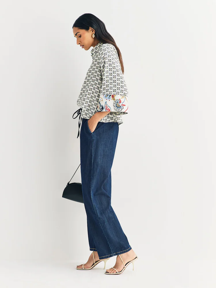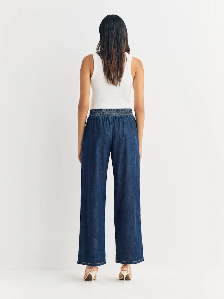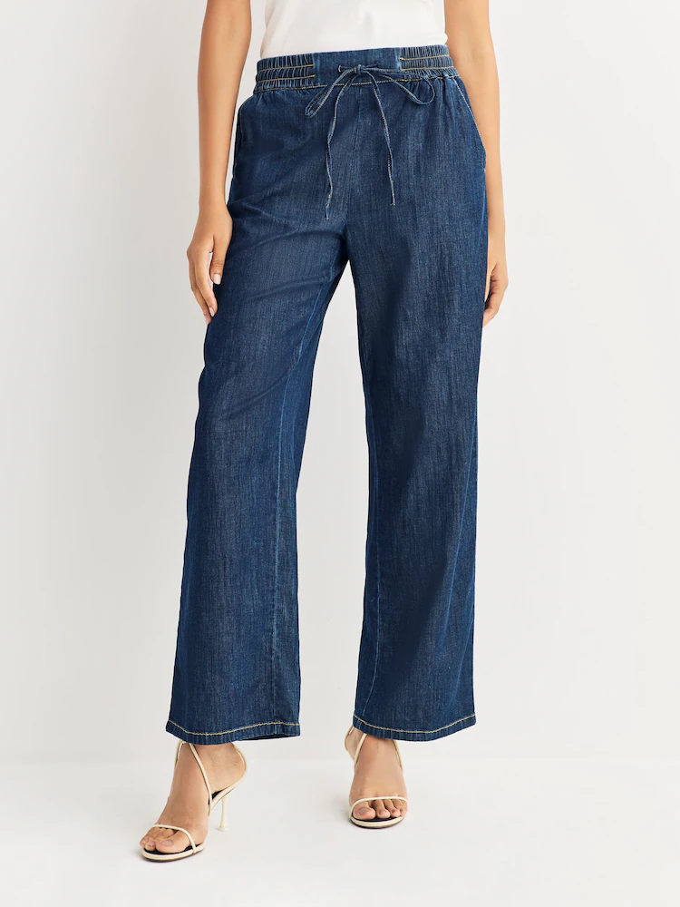 Ohuet ja laskeutuvat farkut kevääseen. Väljähkö malli, sivutaskut ja joustava vyötärö narukiristyksellä.