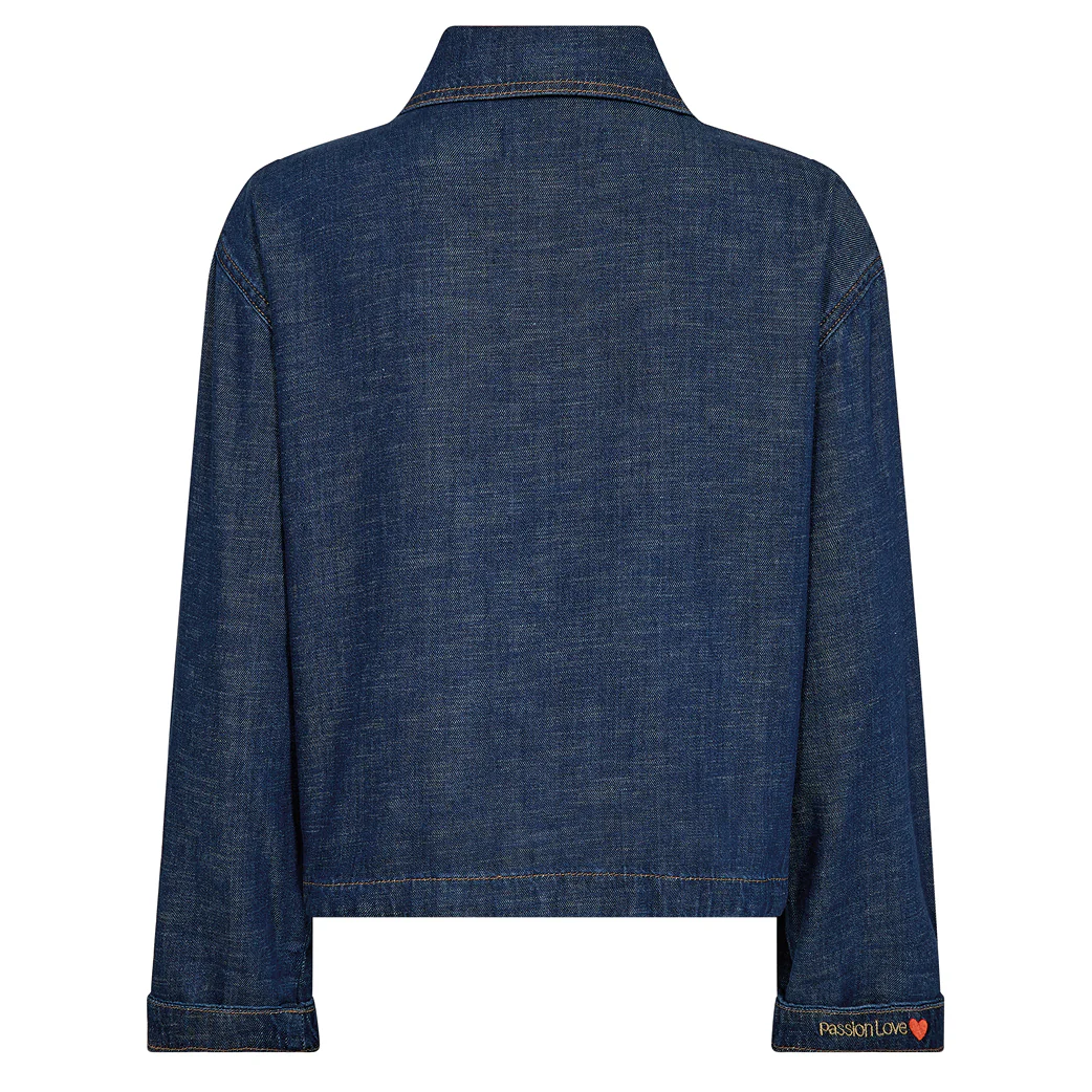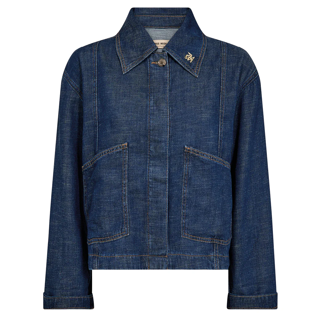Väljä ja laskeutuva farkkutakki piilonapituksella. Jakun etuosassa isot taskut. Kauluksessa irrotettava mos mosh-pinssi.