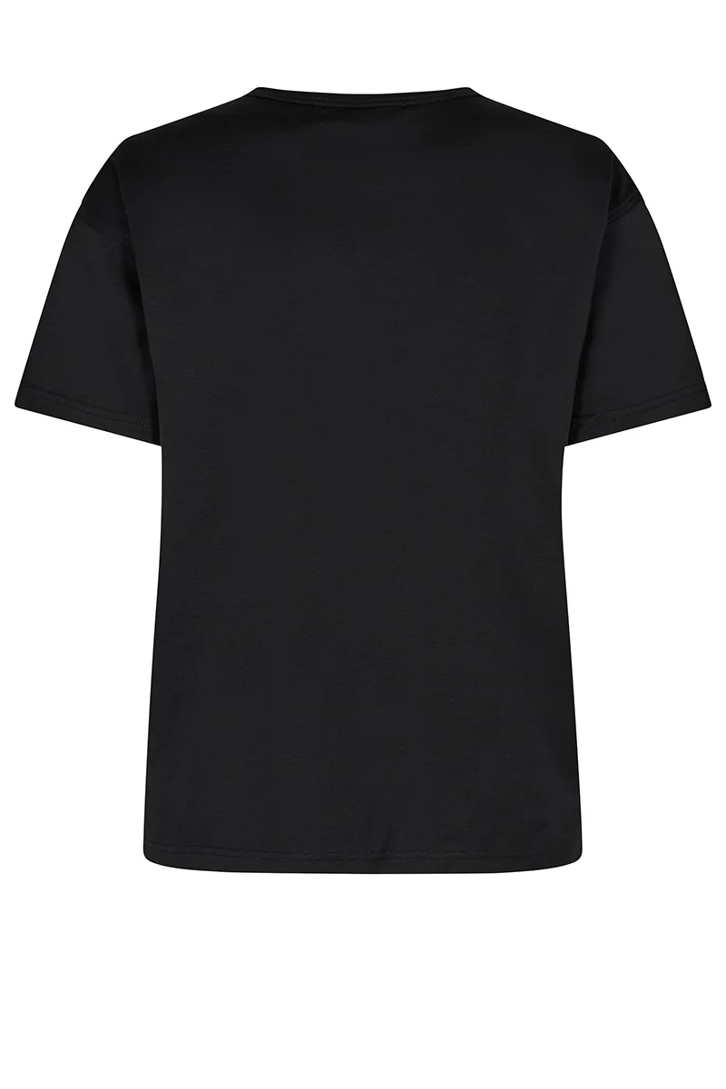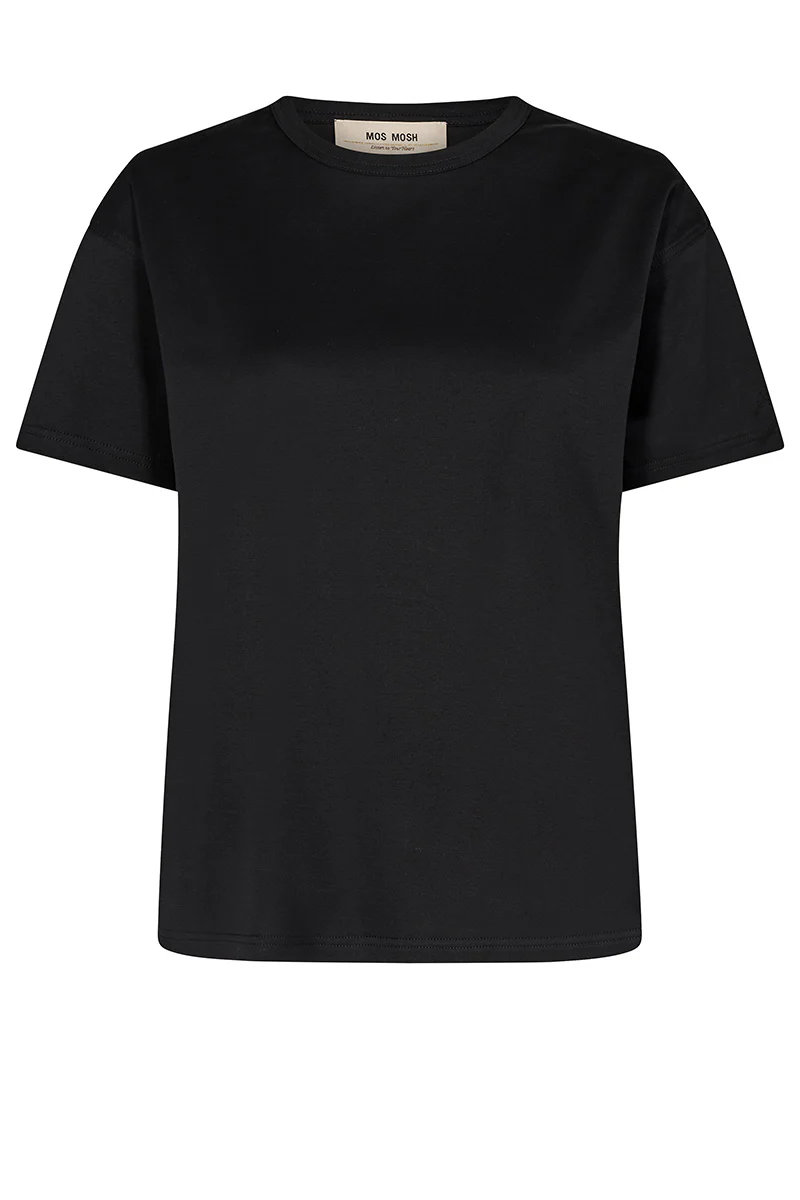 O-pääntiellä oleva musta t-paita. Sileä siisti pinta. Suora malli.