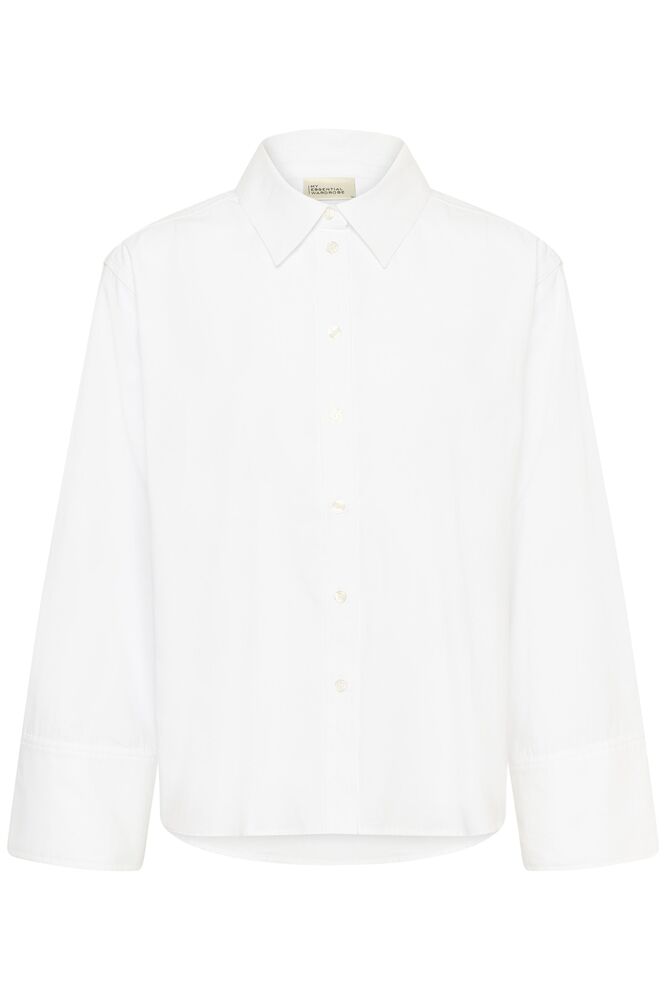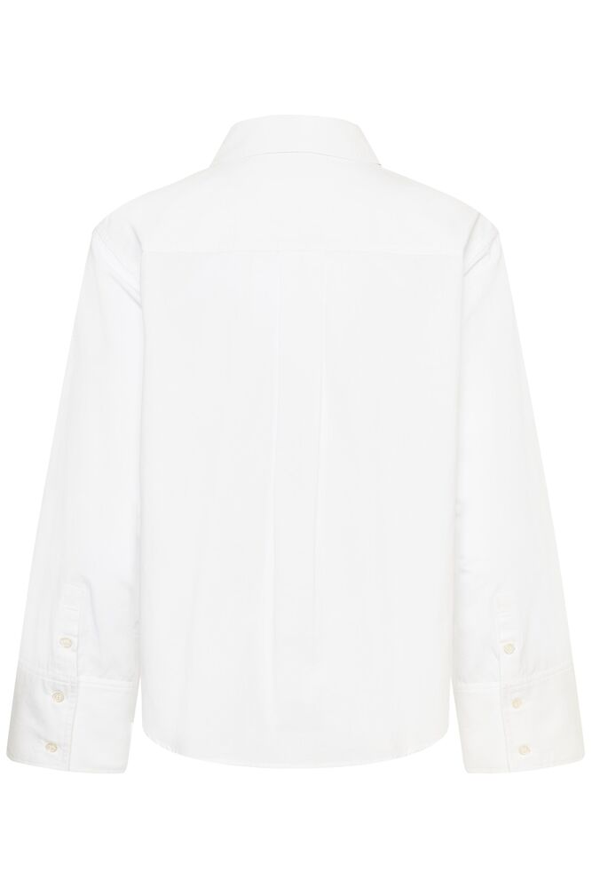 Valkoinen paitapusero on vaatekaapin kulmakivi. Väljä paitis, takaosa hieman etuosaa pidempi. Nappilista ja kaulukset. Leveä hihansuu tuo uudenlaista ilmettä klassikkovaateeseen.