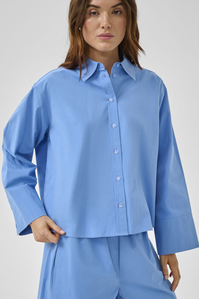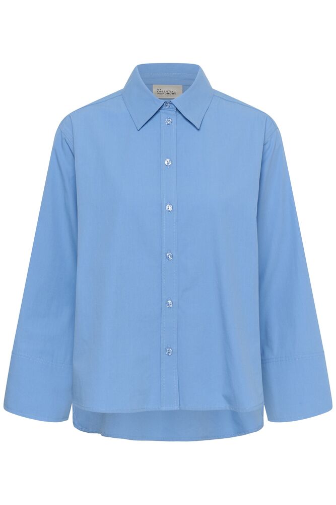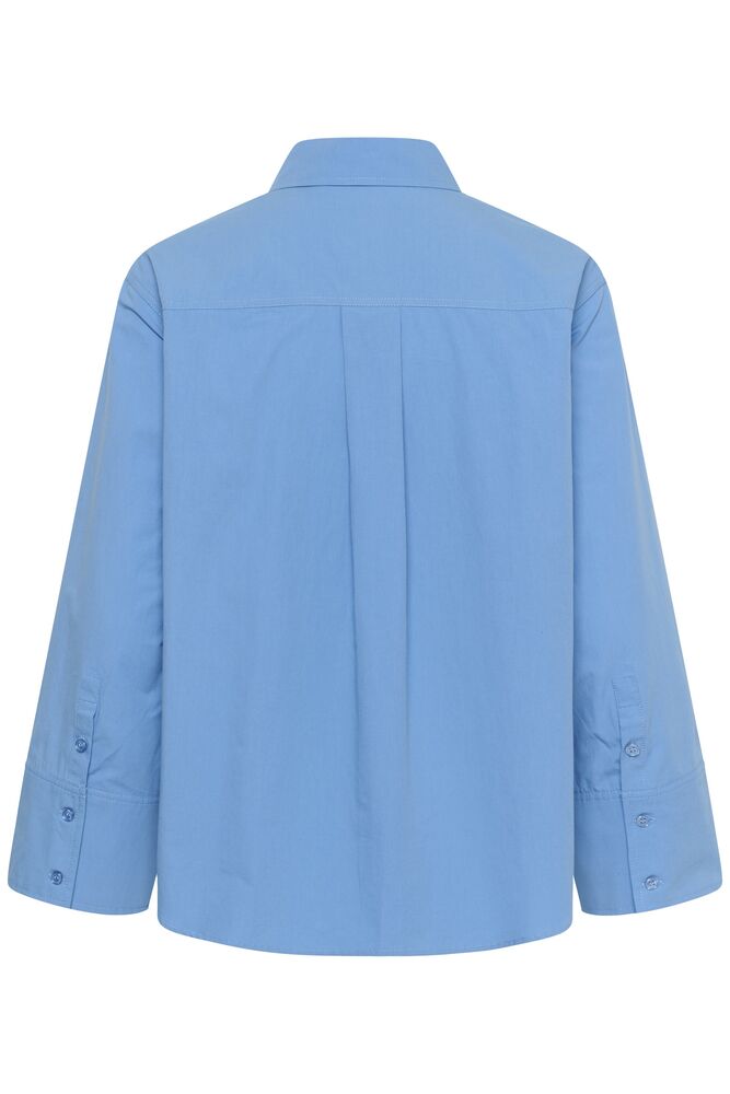 Upean sininen paitapusero on vaatekaapin kulmakivi. Väljä paitis, takaosa hieman etuosaa pidempi. Nappilista ja kaulukset. Leveä hihansuu tuo uudenlaista ilmettä klassikkovaateeseen.