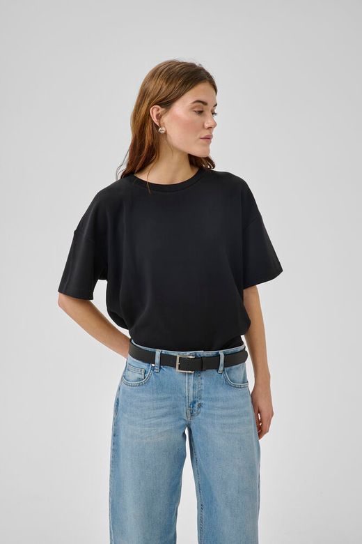 Miellyttävä pehmeää ja laskeutuvaa materiaalia oleva boxy-mallinen t-paita. O-pääntie ja lyhyt hiha.