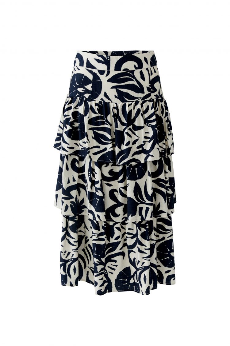 Yli polven mittainen frillahame. Vyötäröllä vetoketjukiinnitys. Väri: sinivalkoinen
