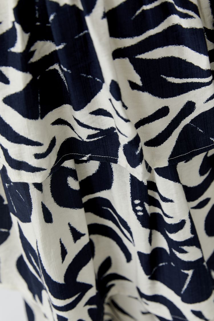 Mekossa yhdistyvät kauluspaitamainen, istuva yläosa ja hulmuava, leveä helma. Pitkät hihat ja kahdesta frillasta koostuva runsas helma. Materiaali on kevyen ylellistä ja joustavaa puuvilla-polyamidi-sekoitetta.