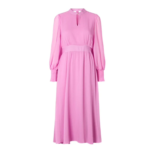 Kaunis mekko ohutta sifonkilaatua, alushame. Poikkileikkaus hieman vyötärön yläpuolella, takaosa joustaa. Pieni pystykaulus, edessä kultainen koristenappi, takana solmittava nauha, Hihat läpikuultavaa materiaalia, hihansuissa smokkirypytys. Kiinniommeltu vuorikangas 100% viskoosi