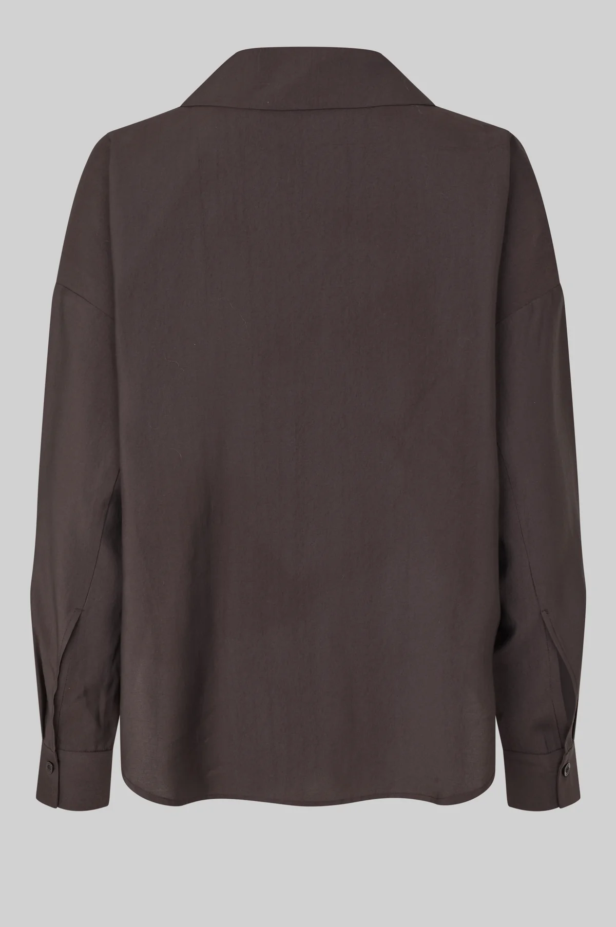 Modaalisekoitteinen laskeutuva ja väljä paitapusero kauluksilla. Pudotettu hiha. Hihansuussa nappi. V-pääntie. Väri: chocolate torte