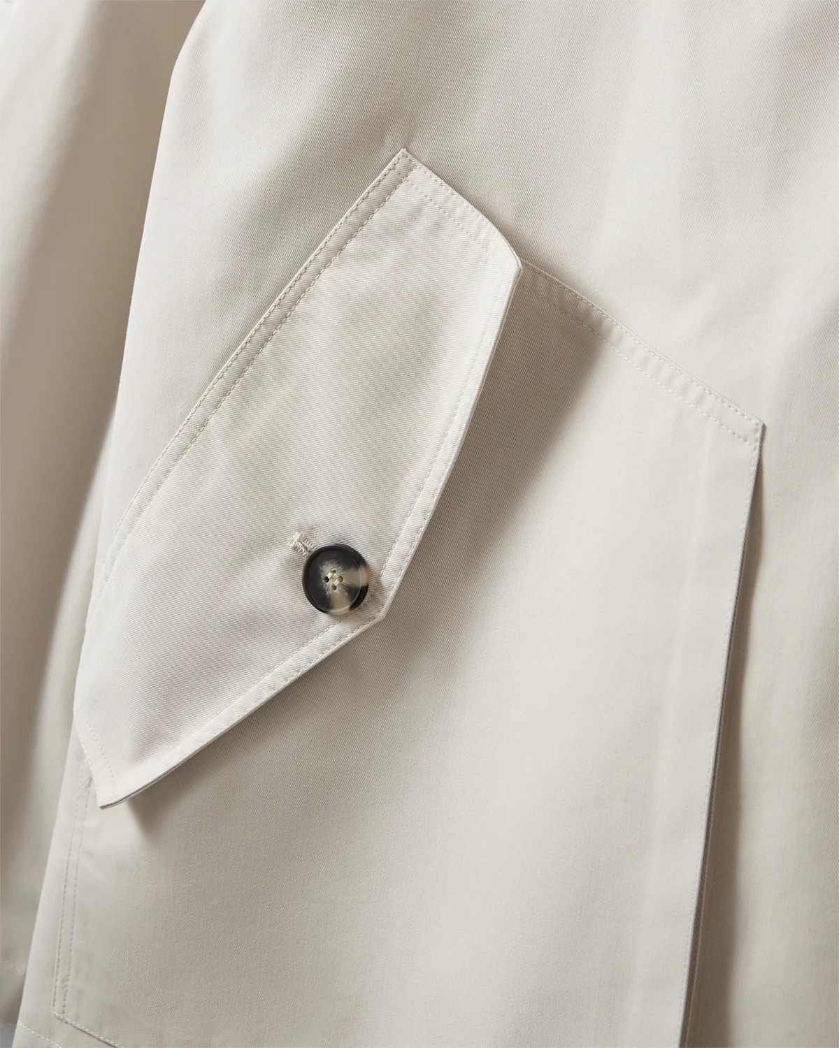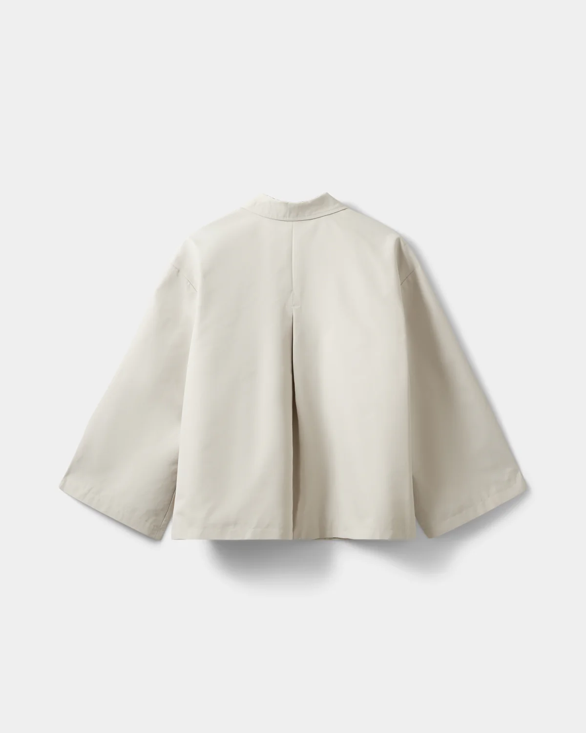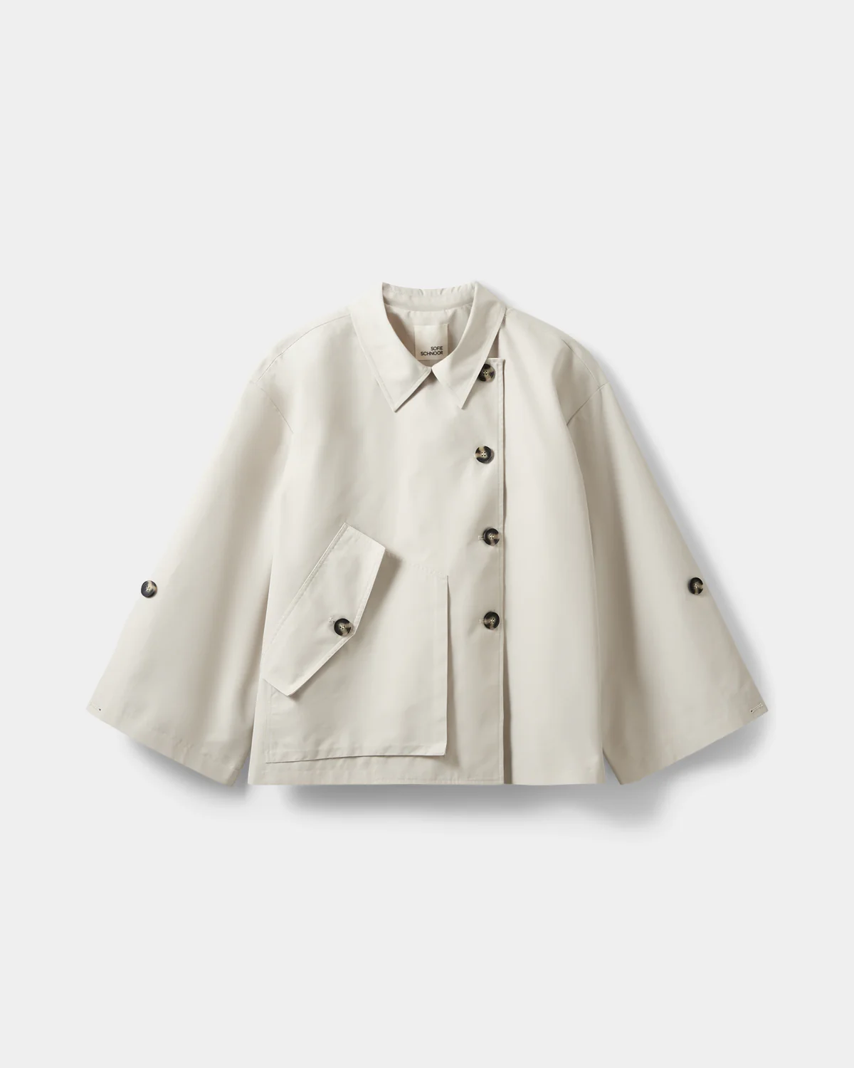 Lyhyt kevät takki nappikiinnityksellä ja isolla yksityiskohtaisella taskulla etuosassa. Kaunis vaalea sävy. Vuorikangas samassa sävyssä.