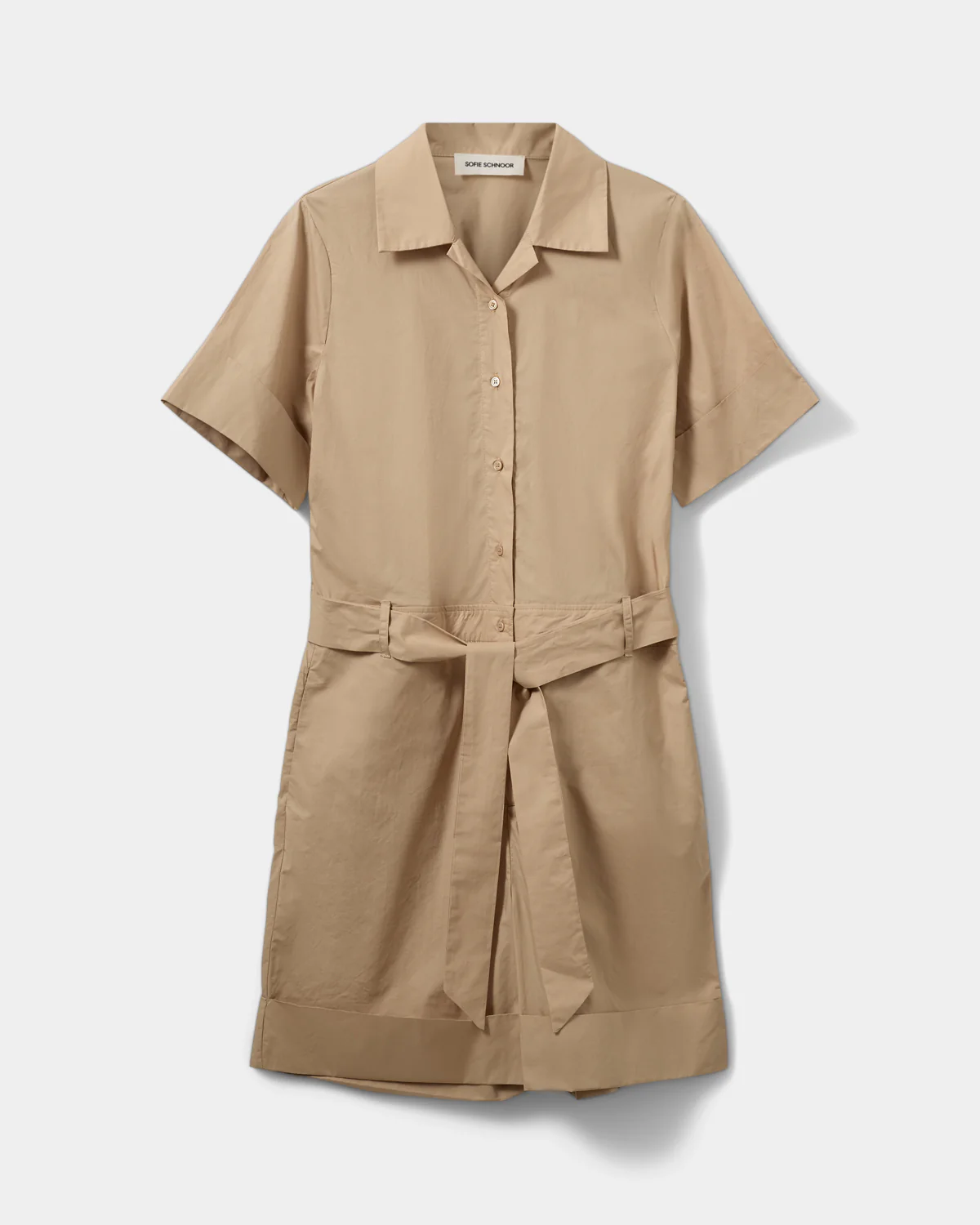Väljä popliininen shortsiasu jossa vyö ja sivutaskut. Edessä nappikiinnitys.