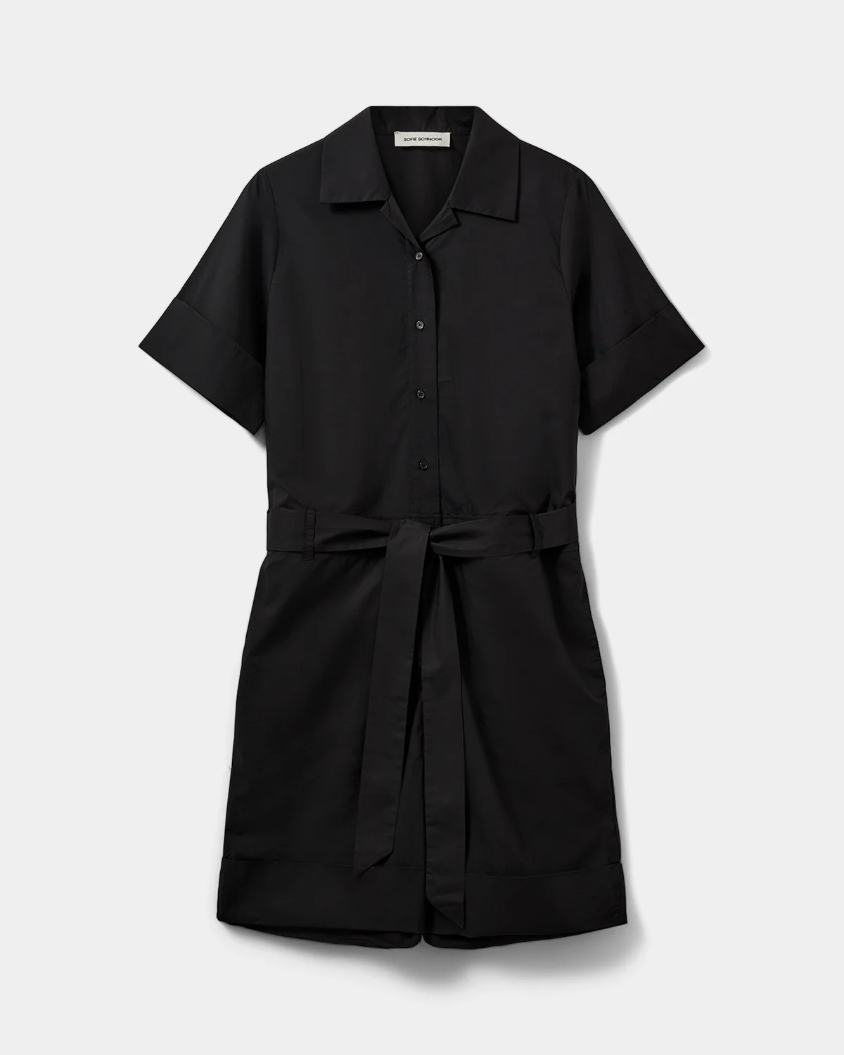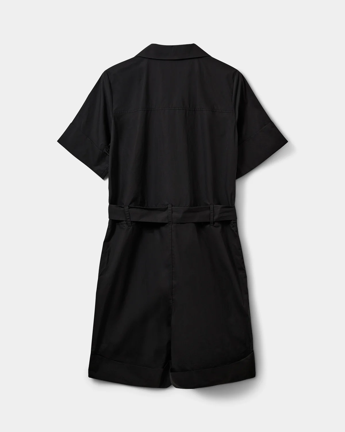Väljä popliininen shortsiasu jossa vyö ja sivutaskut. Edessä nappikiinnitys.