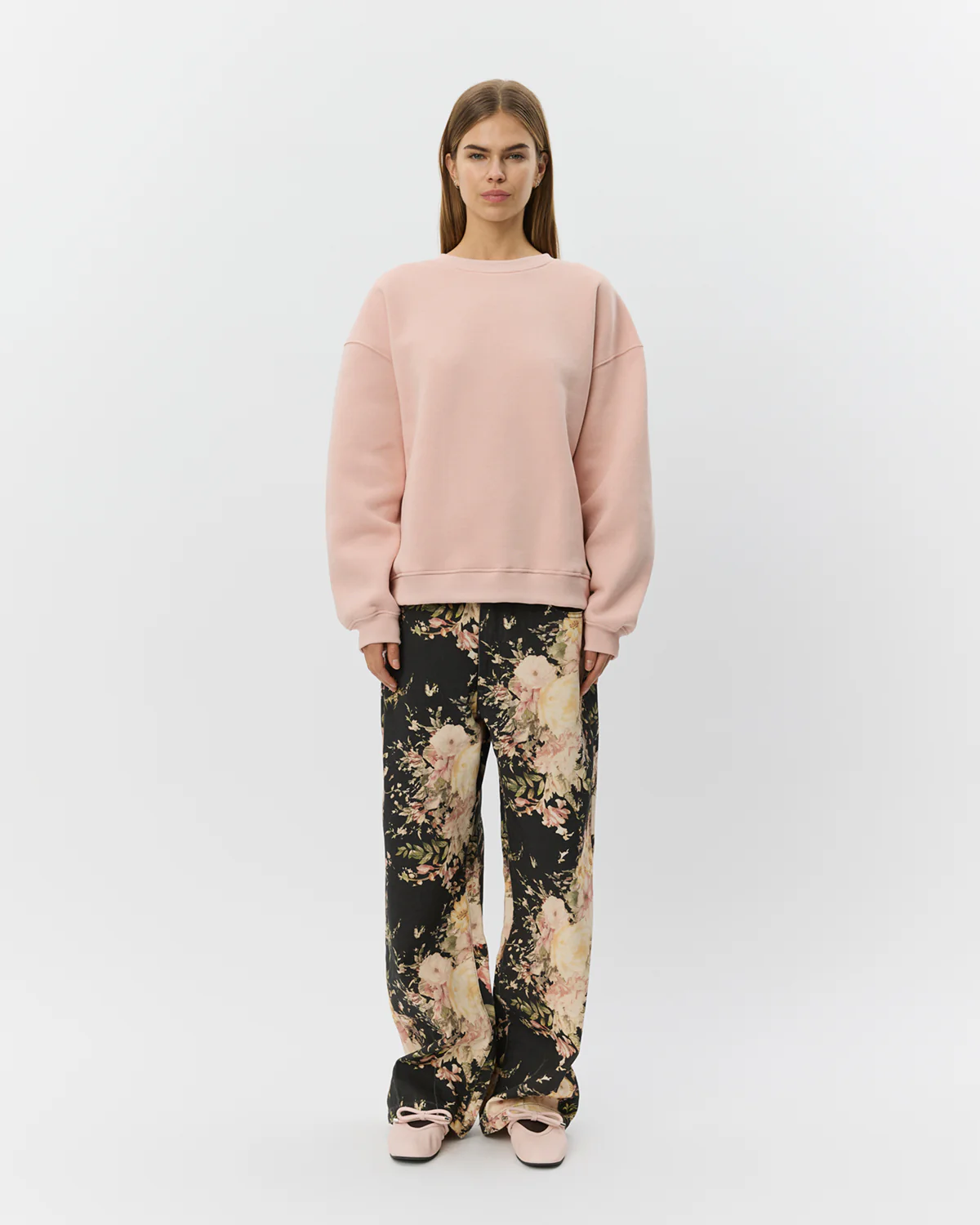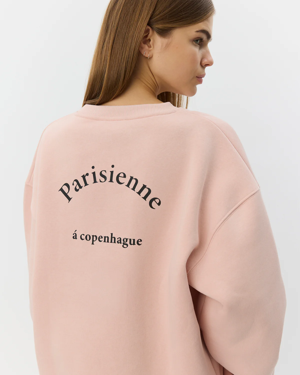 Väljä collegepaita hennon pinkin sävyssä. Pyöreä pääntie jossa resori. Pudotettu olkapäälinja. Paidan takaosassa kirjoitus ”Parisienne a copenhague”. Kuvassa koko S, malli 177 cm.